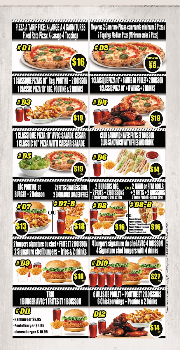 1 grande pizza classique, frites, 4 morceaux de poulet ou 12 ailes de poulet et 2 boissons. / 1 large classic pizza, French fries, 4 pieces of chicken or 12 chicken wings and 2 drinks.